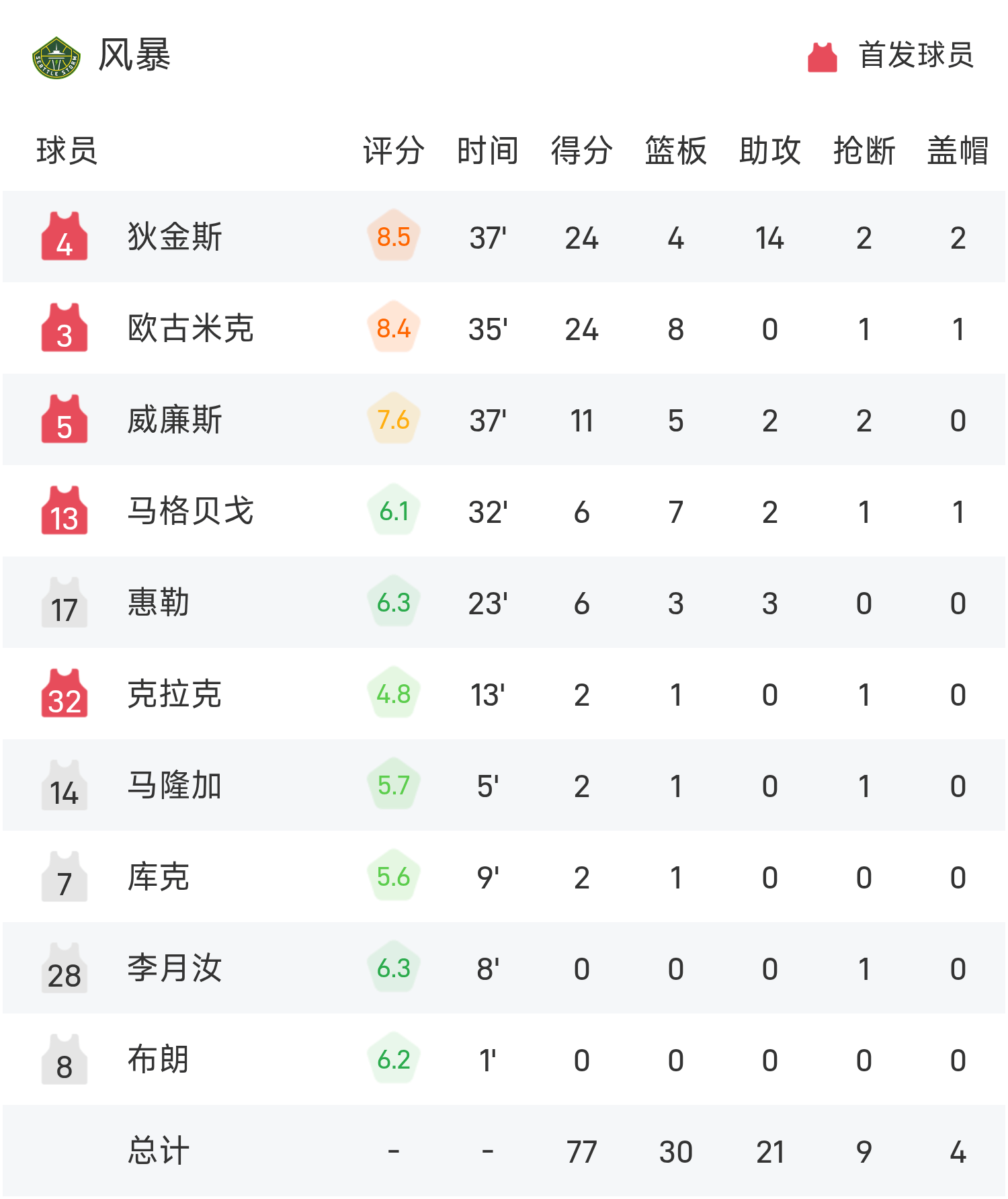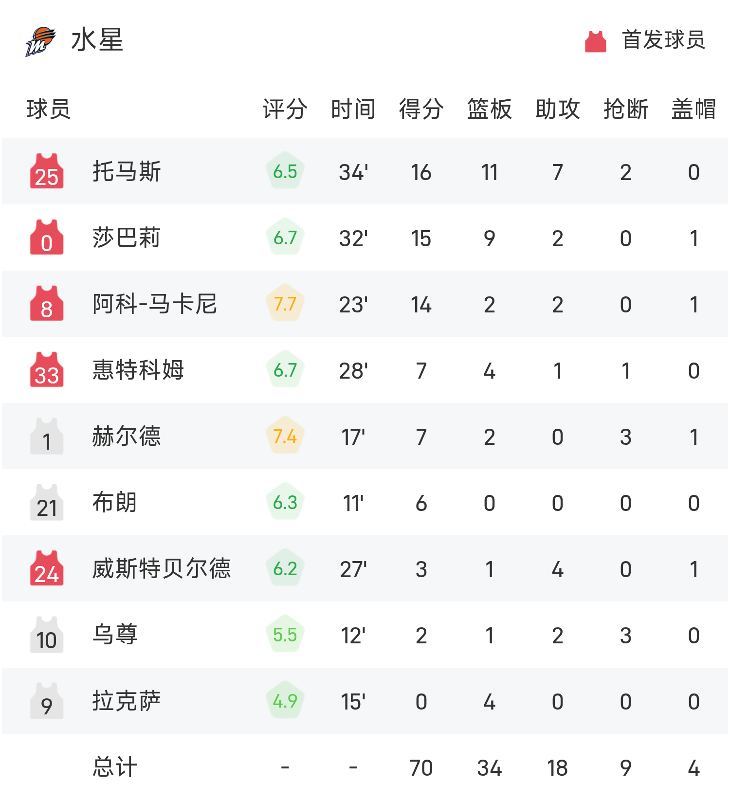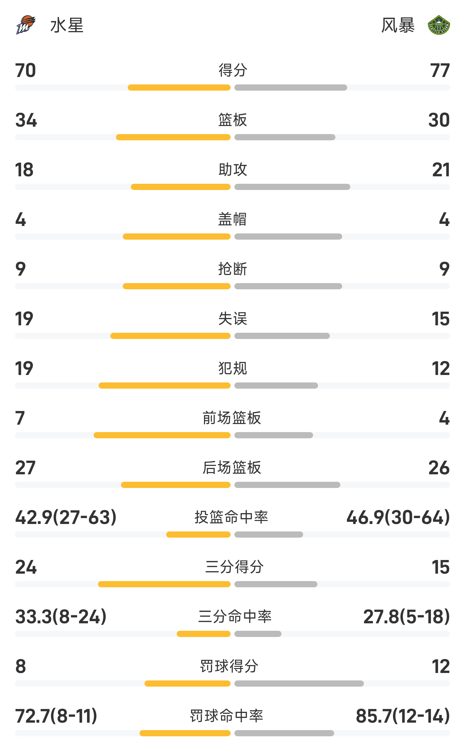 🏀WNBA战报:狄金斯24分14助,托马斯16分11板7助,风暴77-70击败水星